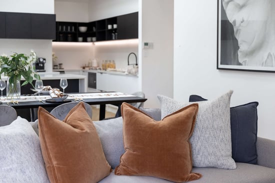 To introduce warmth, subtle yet impactful colour choices were layered throughout the home. In the living area, rich nutmeg velvet was paired with deeper midnight tones to create contrast and depth. This warmth was then echoed in the dining space through thoughtfully chosen textiles, creating visual continuity.